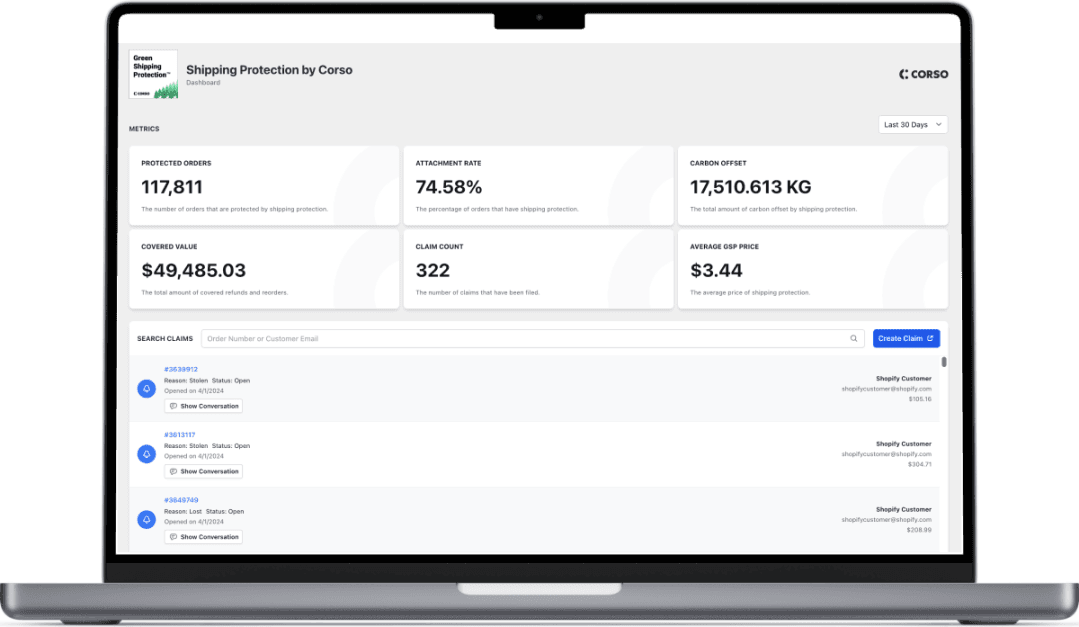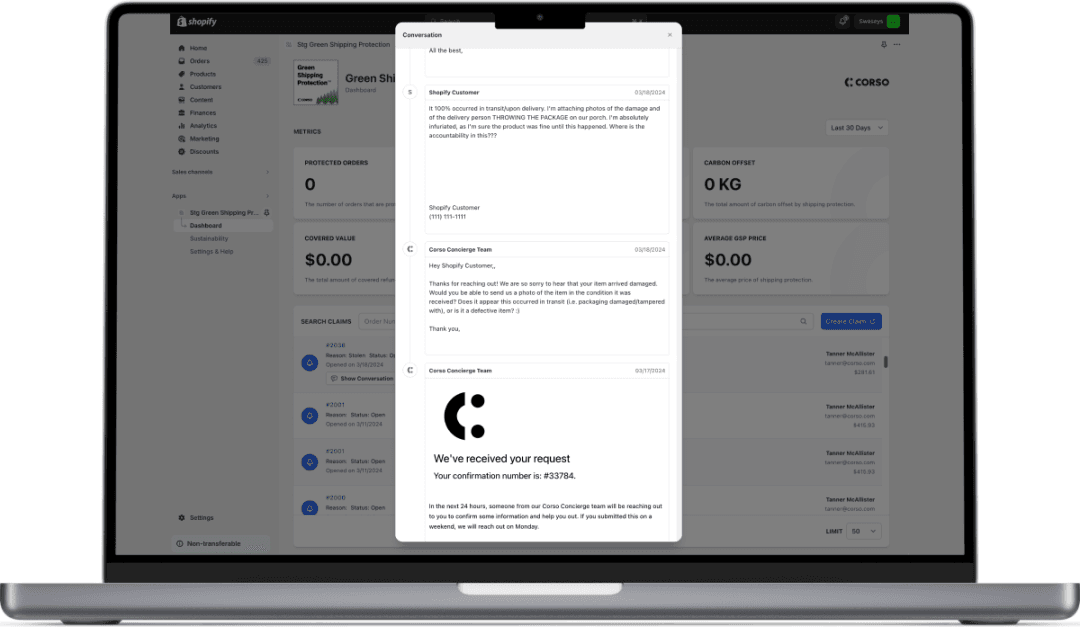 - Conversations Insights: You can now view any conversations the Corso Concierge team is having with your customers within Shipping Protection Claims. This gives you the peace of mind and transparency needed to know that Corso has it covered.