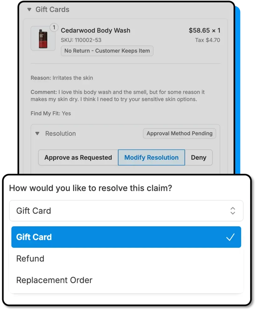 Use the returns and exchanges settings to configure your products for green returns and use the admin to quickly resolve claims with the right resolution.